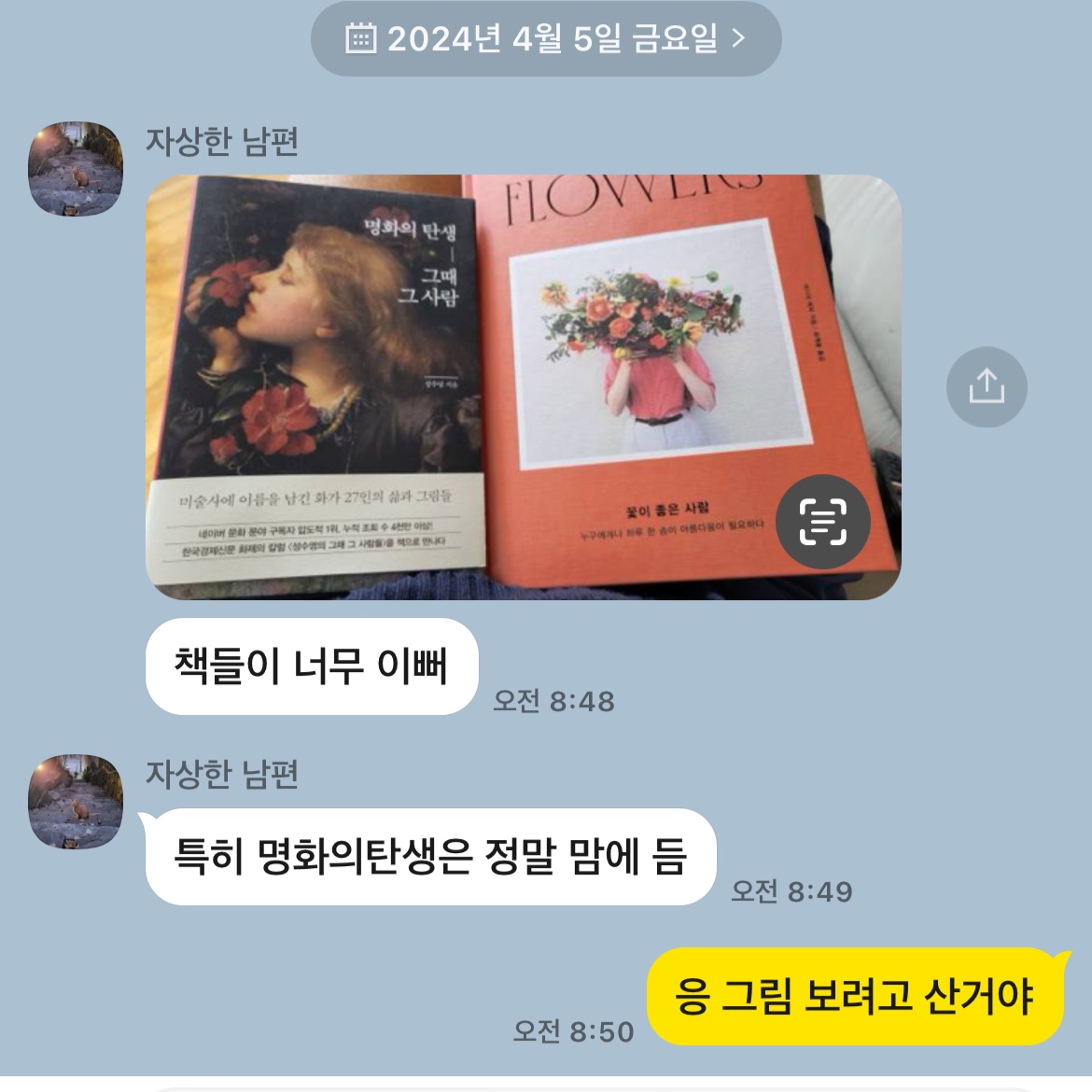 이렇게 두권을 같은 날 배송받아 뜯어서 쇼파에 두고 출근 한 날, 남편한테 카톡이 왔다.